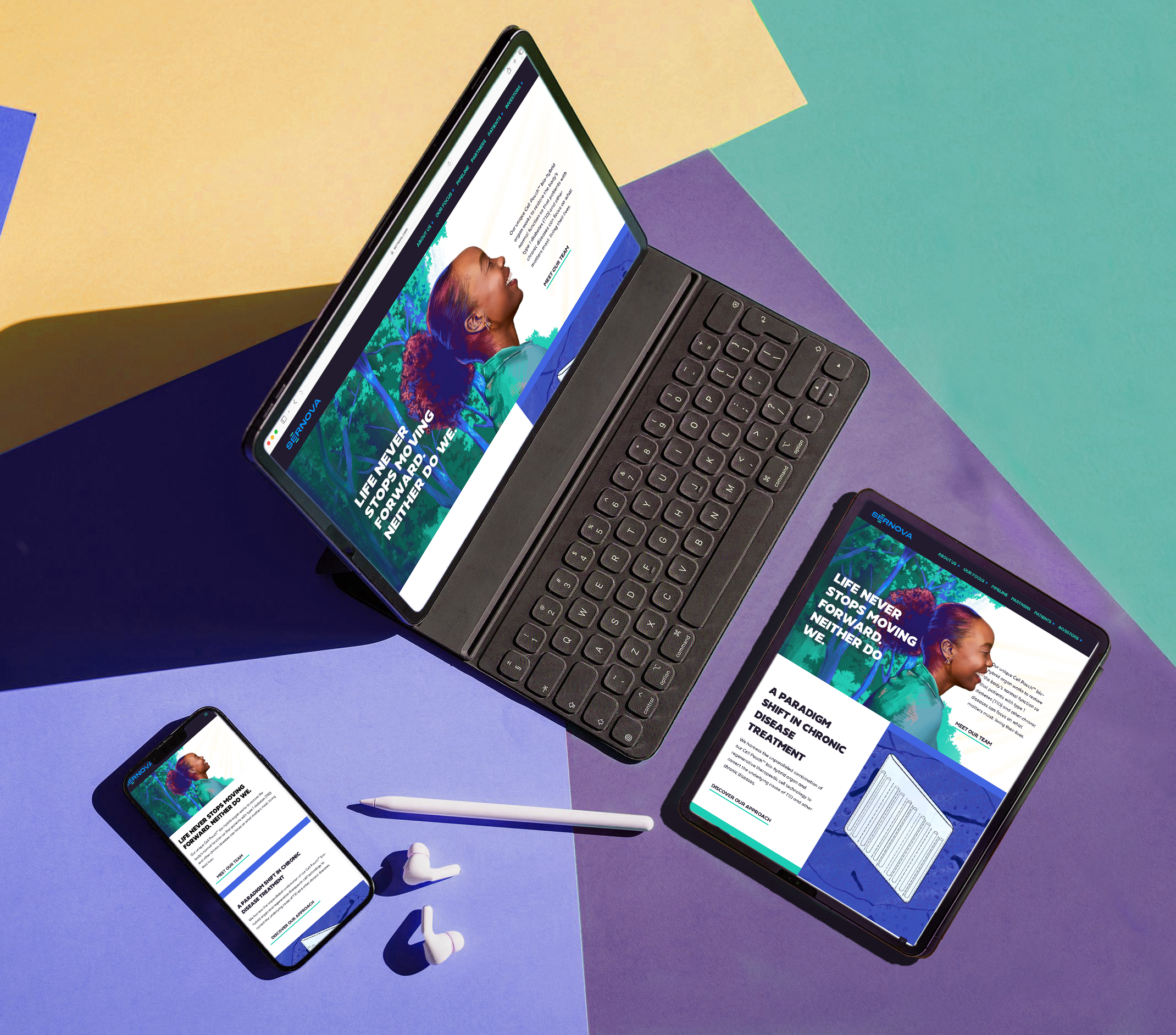 Sernova came to us for a rebrand that felt fresh and patient forward, that made the science of Type 1 Diabetes accessible to different levels of audiences. Our client wanted something bold and different leaning into a hand-crafted, hand-drawn style. This helped inspire the micro-campaign of their Kids Corner, for which I developed two characters, Teddi and Charli, who could walk through the science of T1D with younger patient audiences. Roll-out of social media assets and campaign is still ongoing as of Spring 2025.